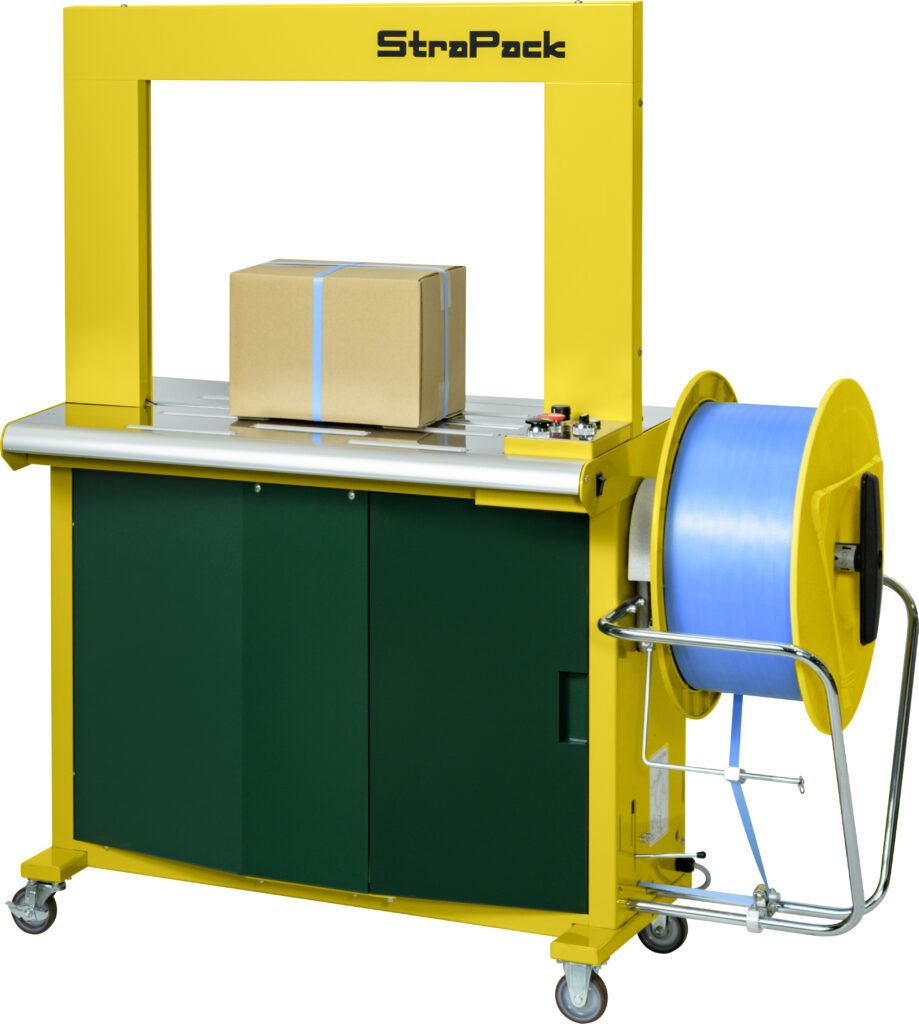 製品を安全に輸送・保管するためにバンドを使って必要な梱包作業を自動化する機械