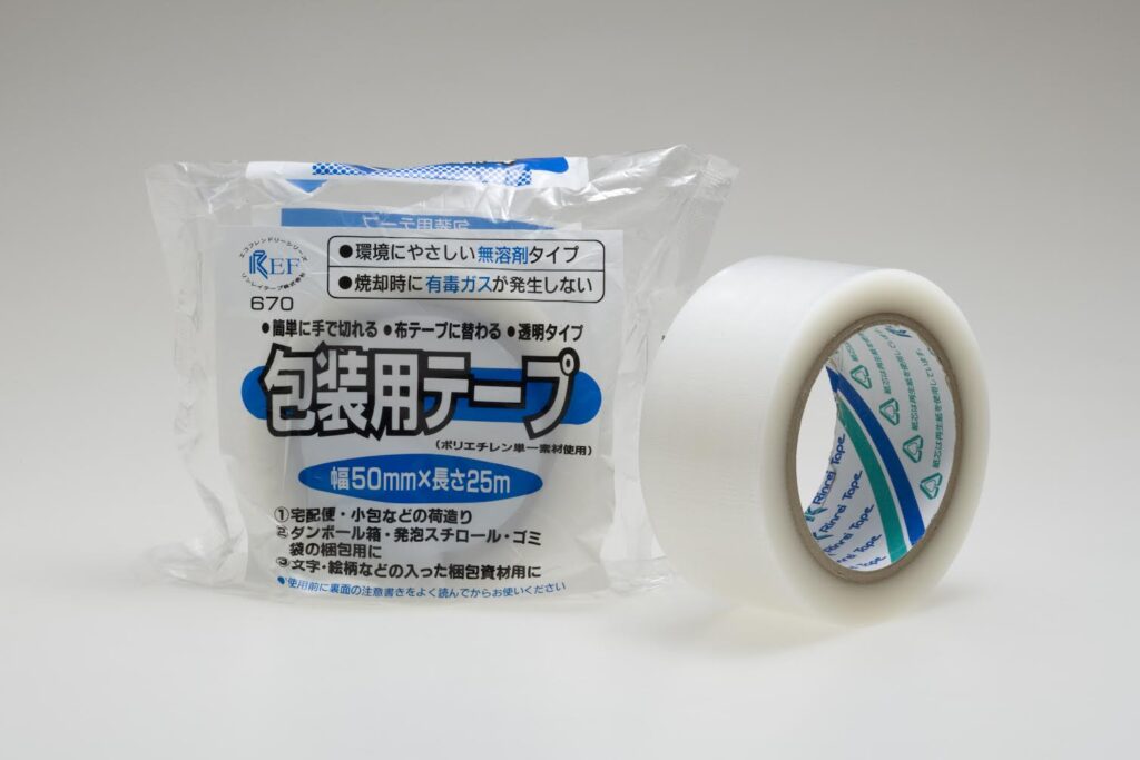 包装用PEテープ。薄くて丈夫、手でまっすぐ切れ、粘着力が強く、フィルムなので水滴にも強く、文字も書ける半透明タイプ。